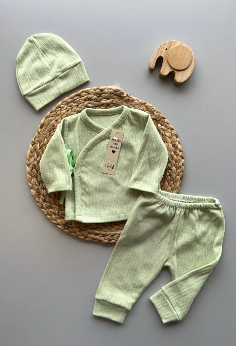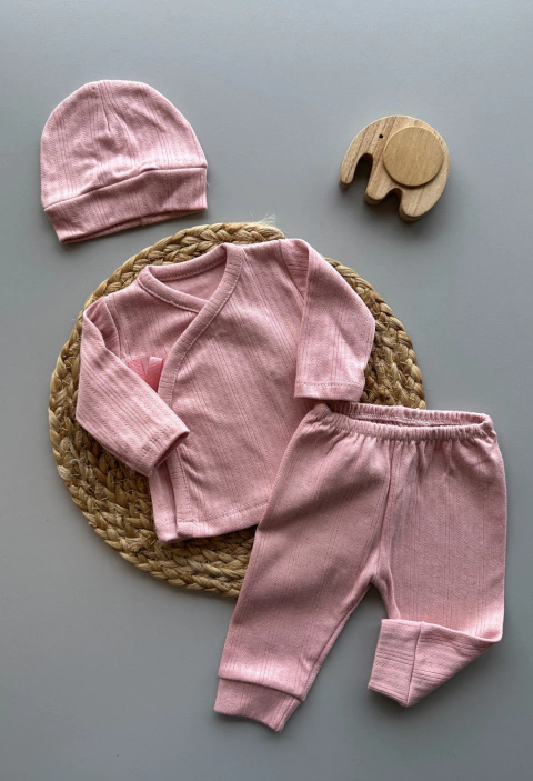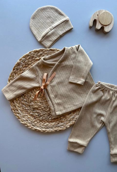 Incluye batita cruzada de manga larga con lazo, ideal para facilitar el cambio y brindar abrigo sin incomodar. Se completa con babucha cómoda y gorrito a juego, creando un ajuar práctico, delicado y funcional.