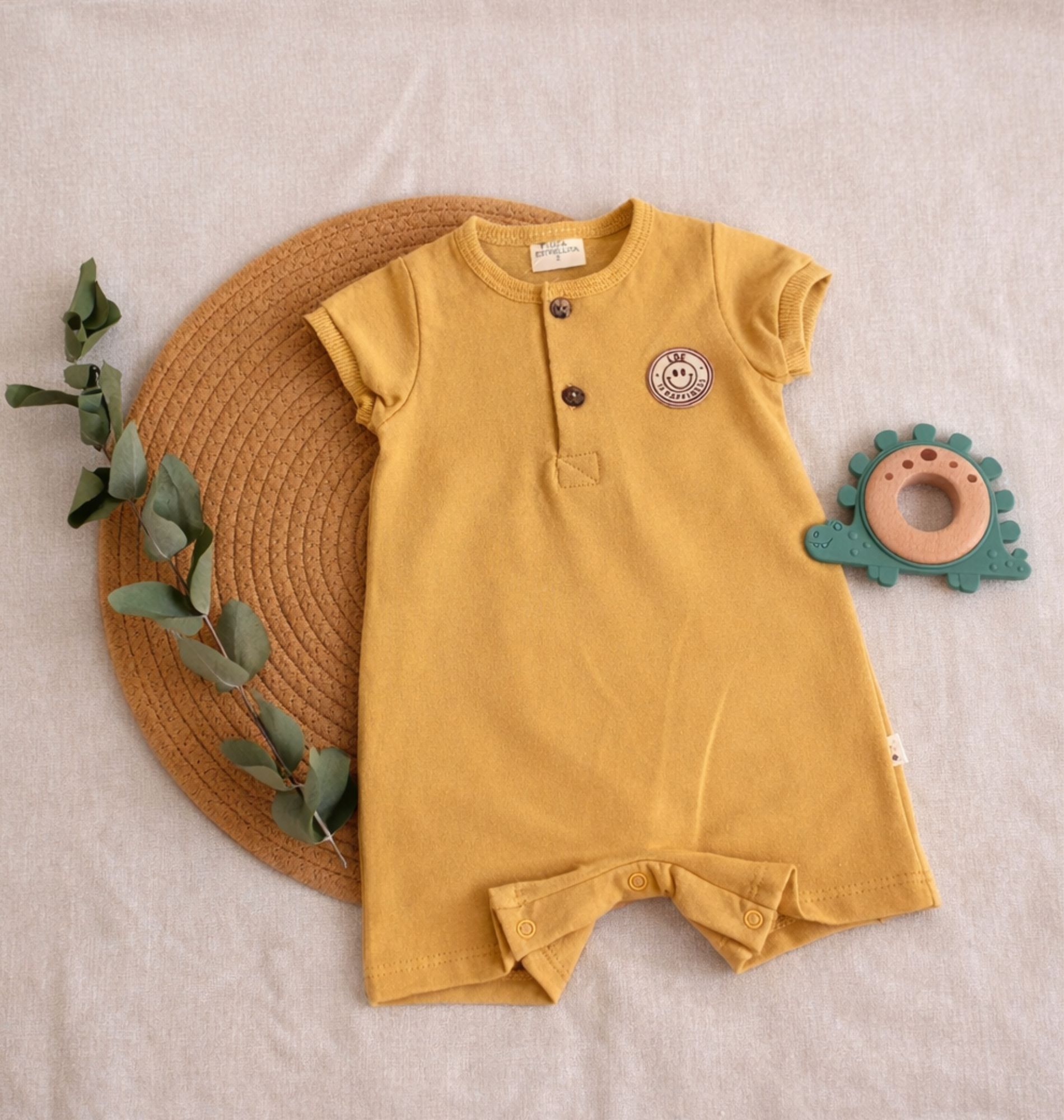 Disponible en colores mostaza y texaco, en talles del 0 al 4. Ideal para bebés en sus primeros meses y años.
