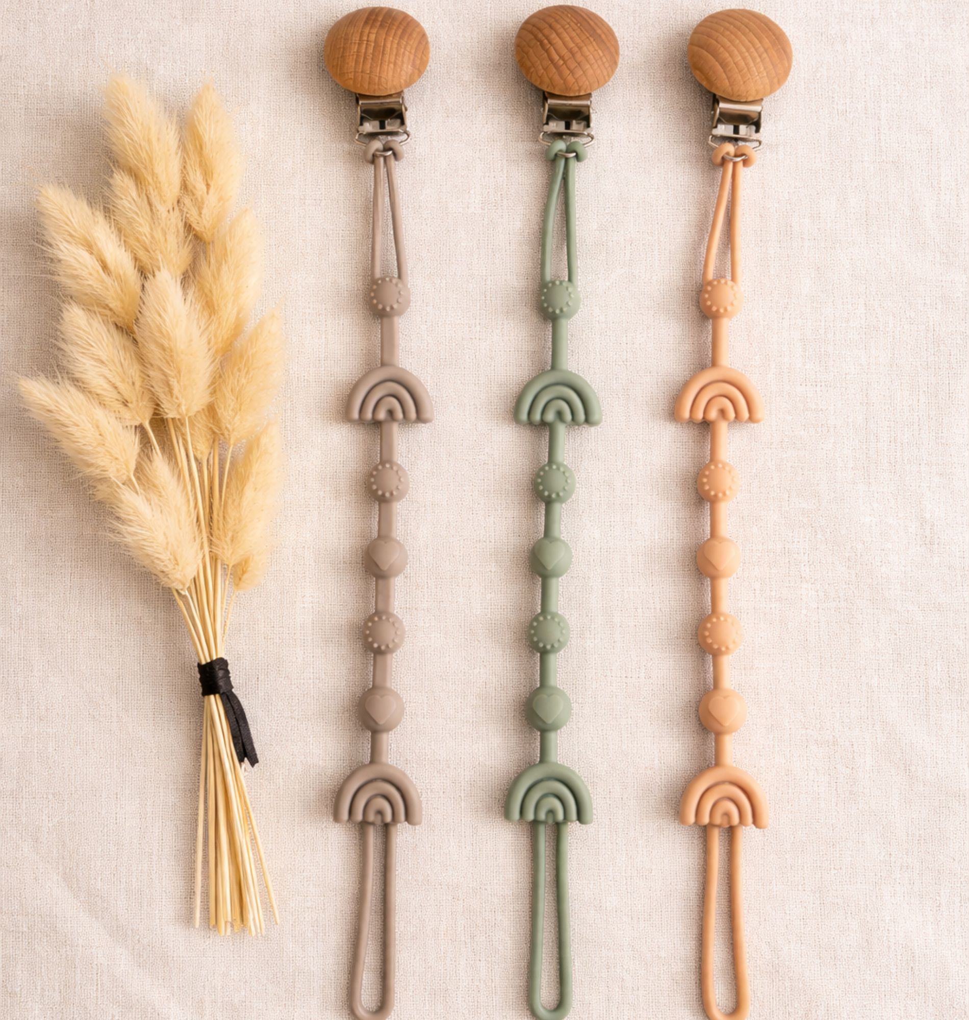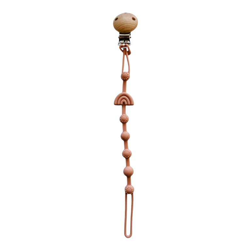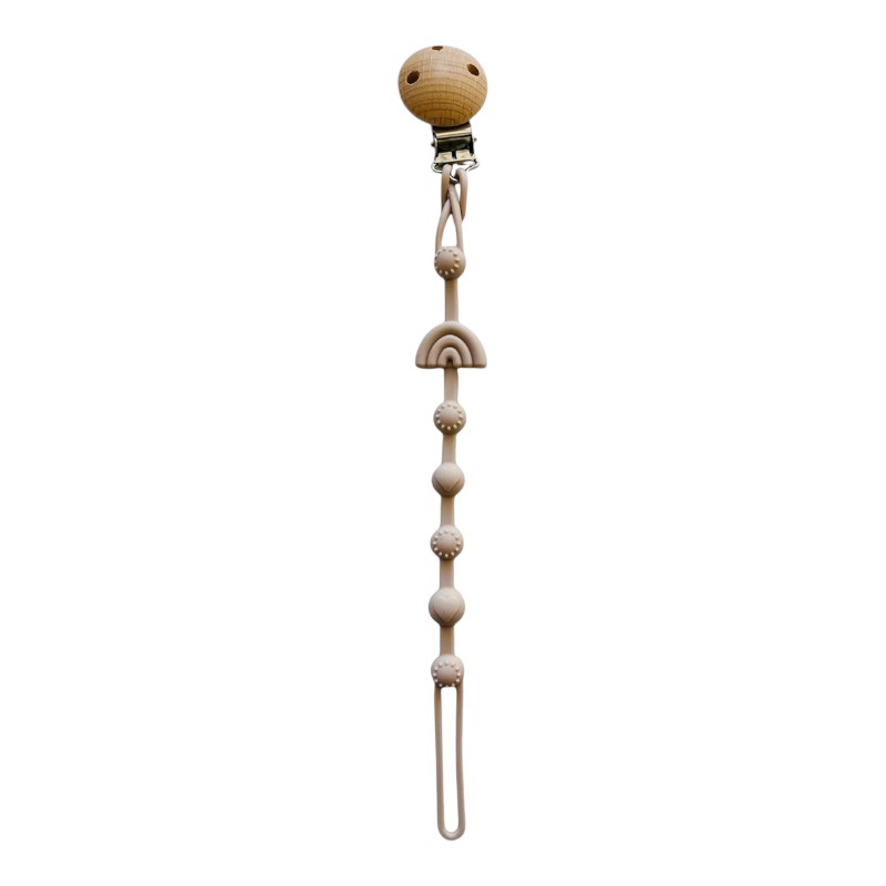 Este portachupete está pensado para mantener el chupete siempre cerca, limpio y seguro, evitando que caiga o se pierda. Combina silicona de grado alimenticio con madera natural, creando un equilibrio entre suavidad, resistencia y calidez.